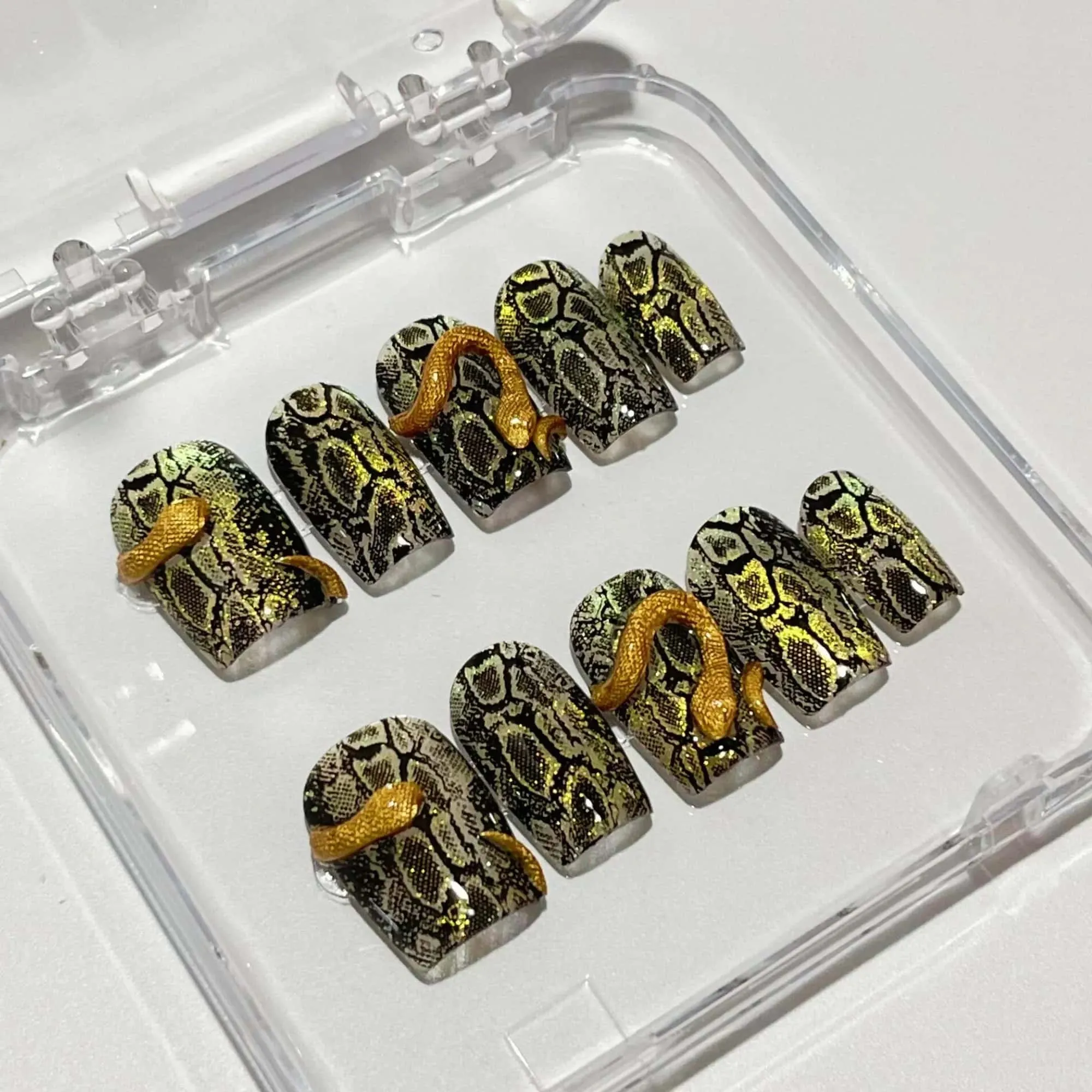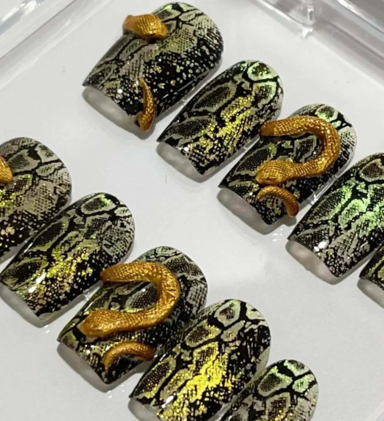 Lead the way this Halloween with our Year of the Snake Press On Nails! Featuring stunning 3D design in gold, these gothic Y2K nails are handmade and reusable, perfect for the season. Stand out at the Halloween party or gift them to a nail art enthusiast!