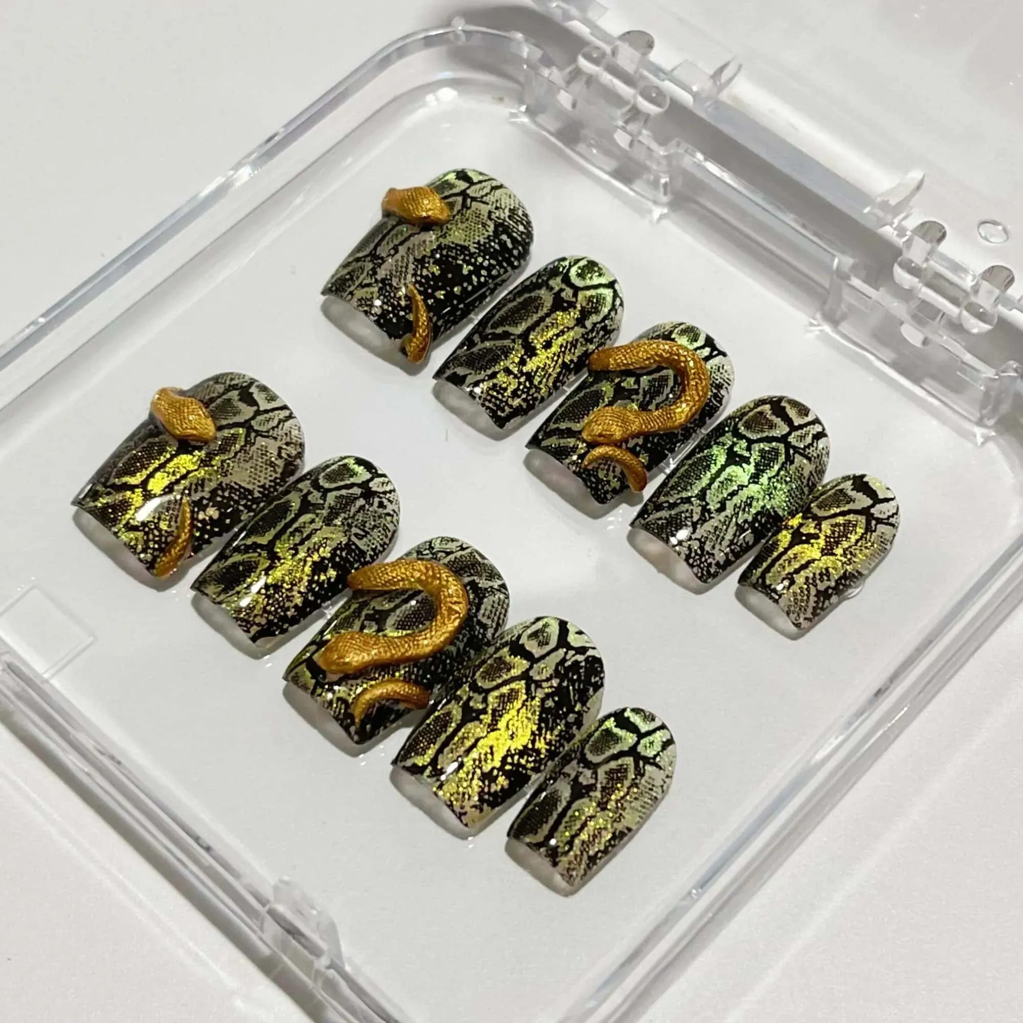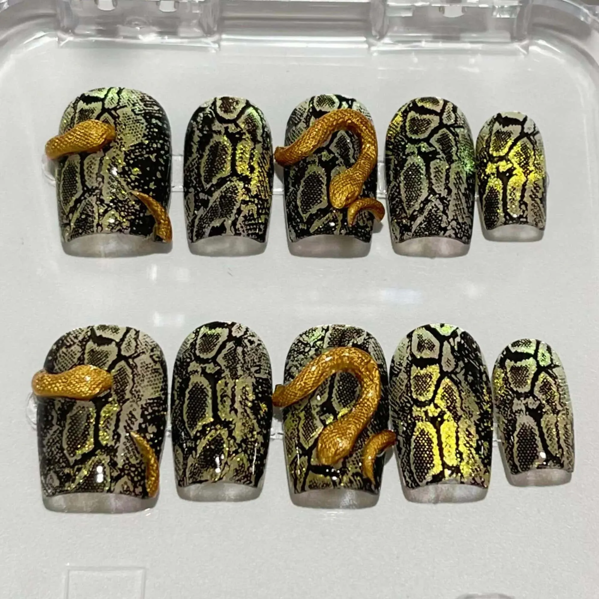 3D Gold Snake Press On Nails: Gothic Y2K Halloween Reusable False Nails