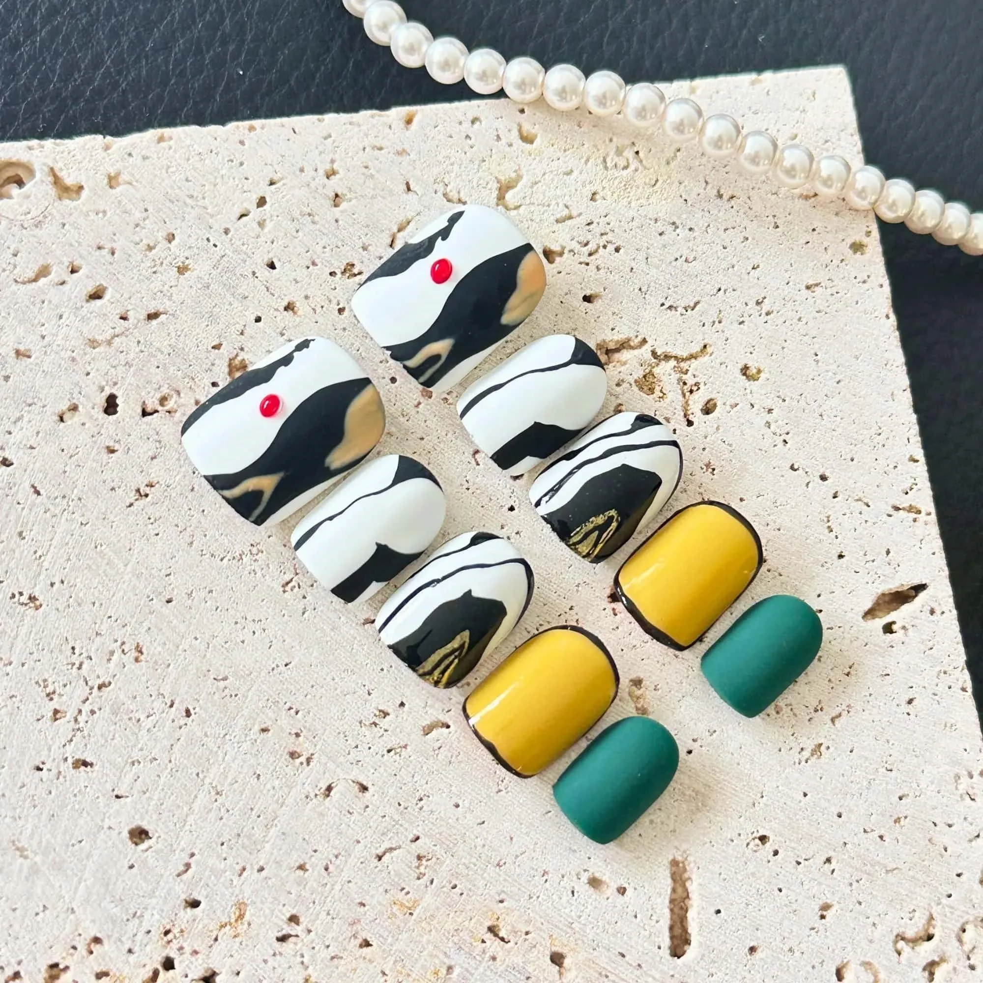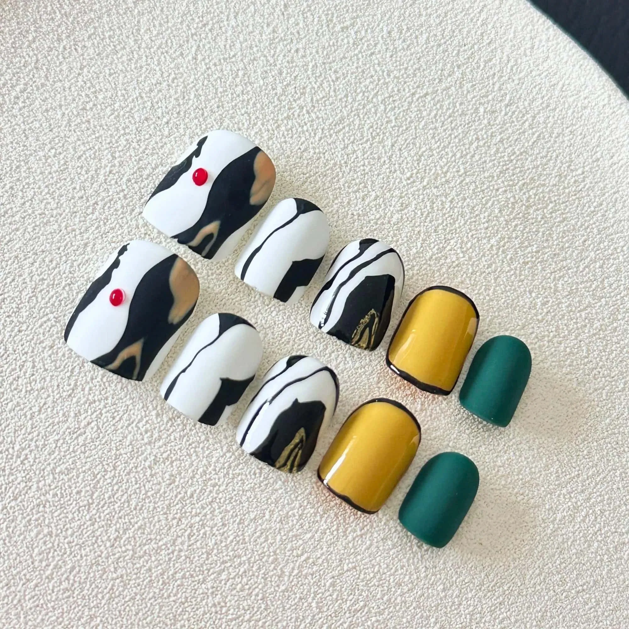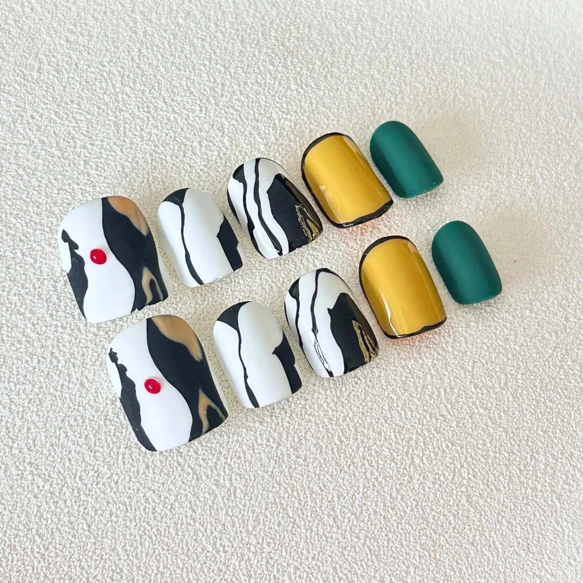 Abstract Press On Nails in Luxe Gold, Emerald Green, and Chic Black & White Marble