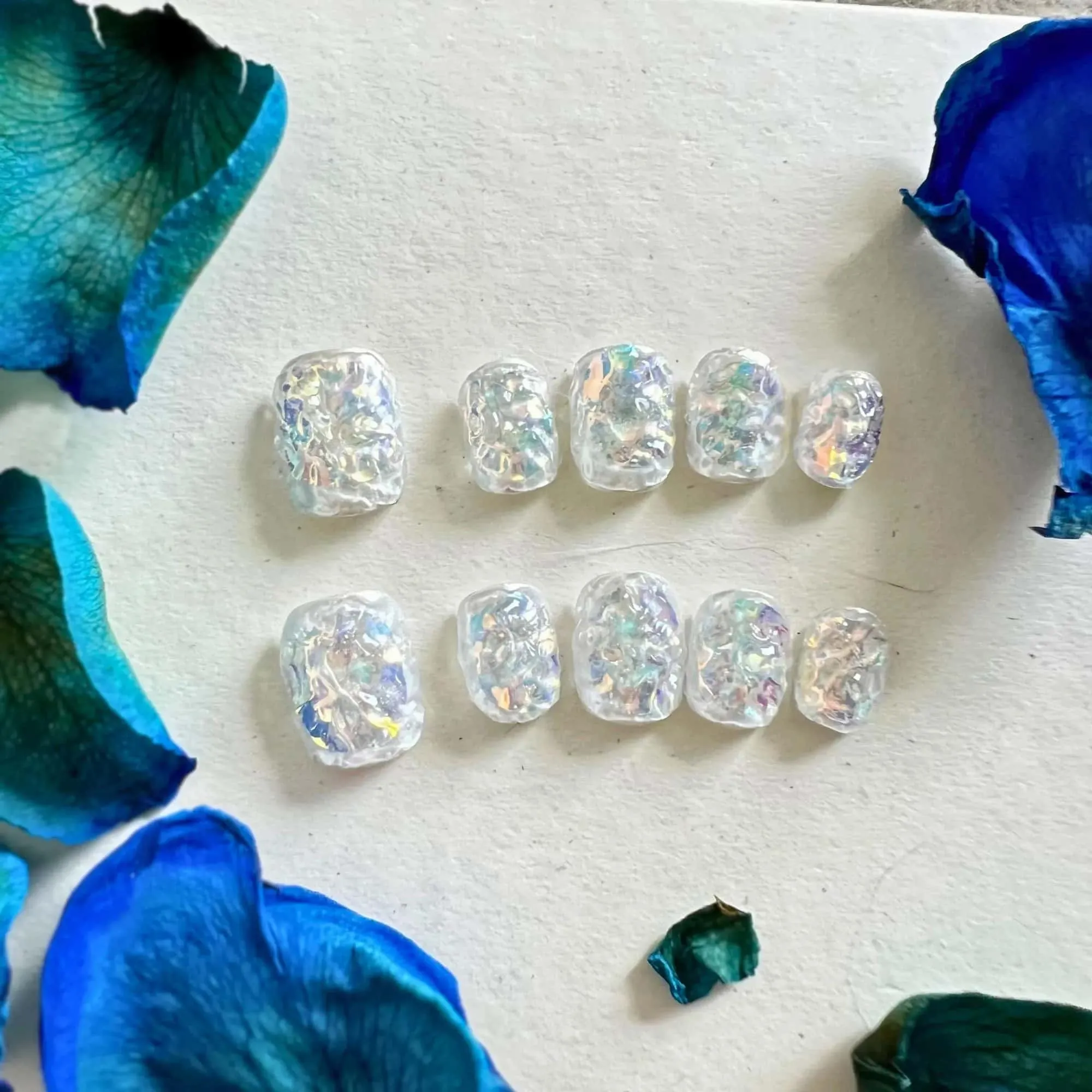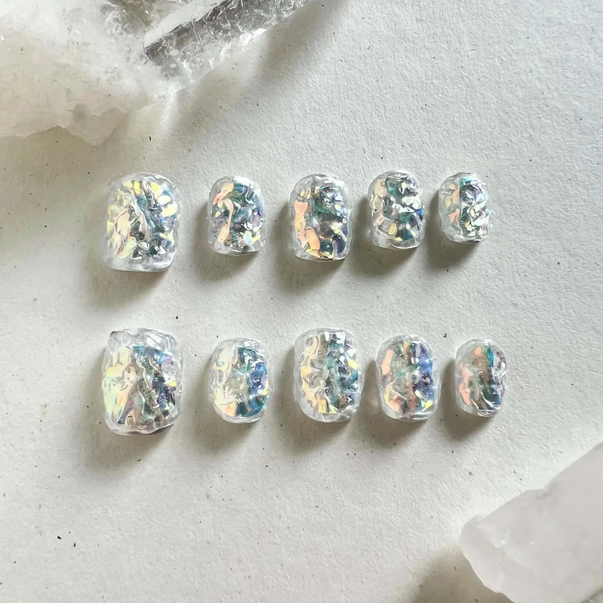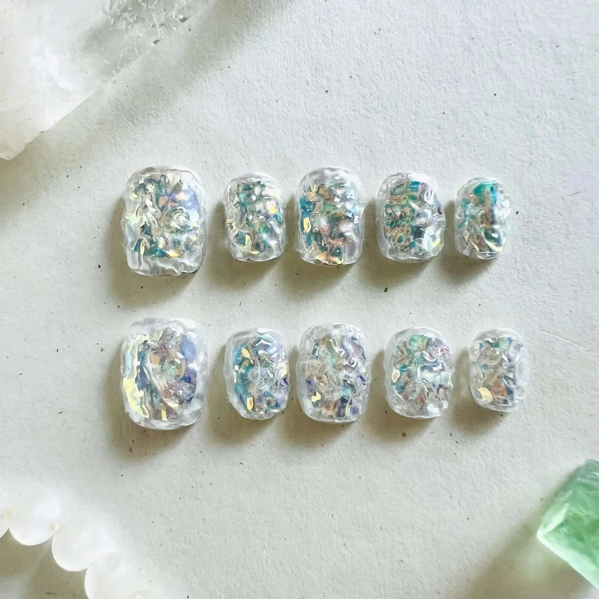 Get ready to dazzle with our Aurora Ice Crystals Press On Nails! Perfect for Fall and Halloween, these reusable handmade fake nails are a stunning gift for her. Stand out with these unique nails that sparkle and shine like ice crystals on a chilly day!