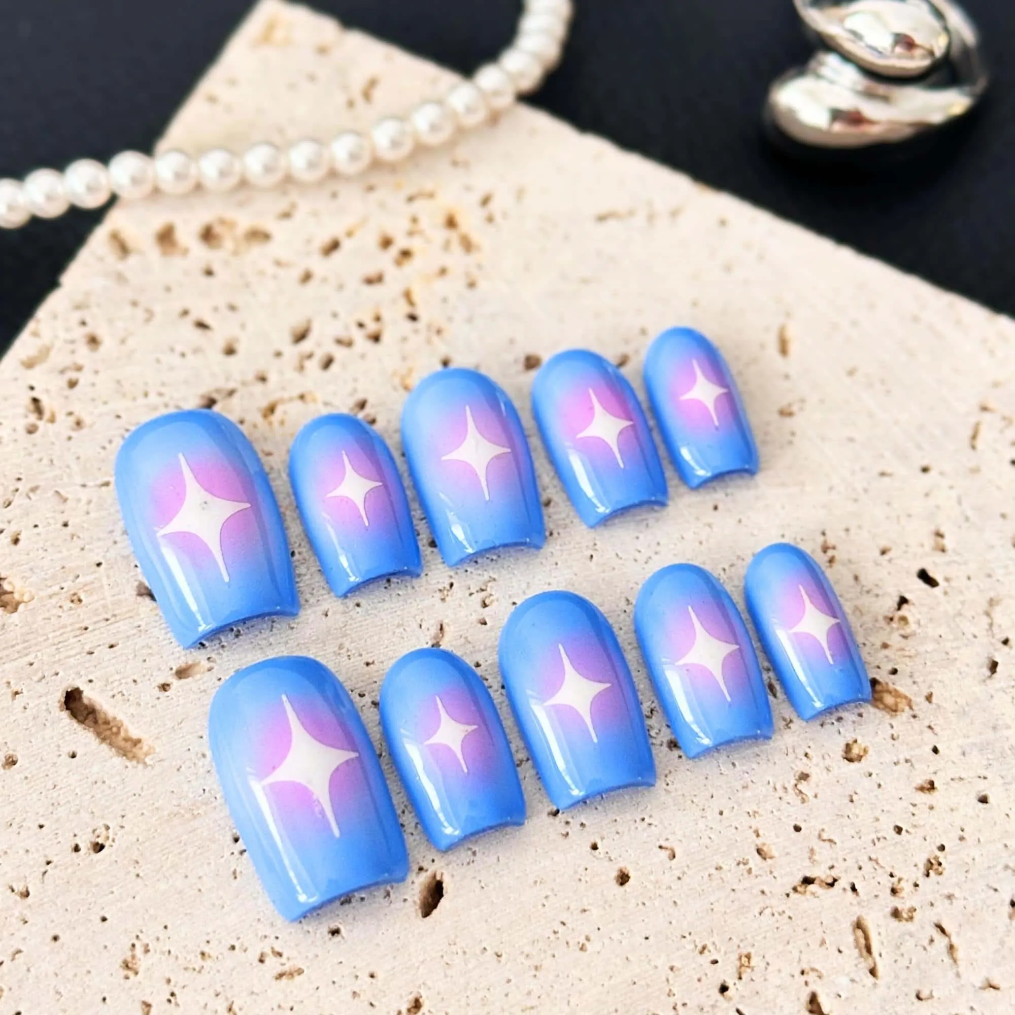 Transform your nails into a mesmerizing starry night with these Handmade Blue Ombre Star Nail Tips. Easy to apply Press On Nails that are perfect for the holiday season or any special occasion. These reusable and durable Fake Nails make a wonderful Gift for Her. Get ready to shine with these Party Nails!