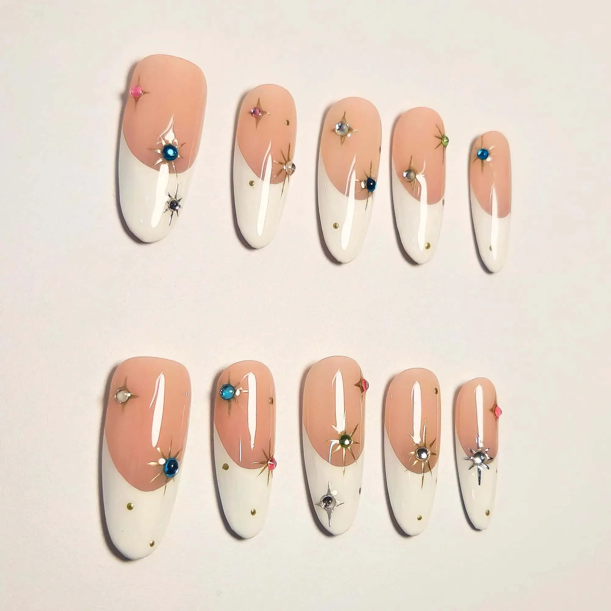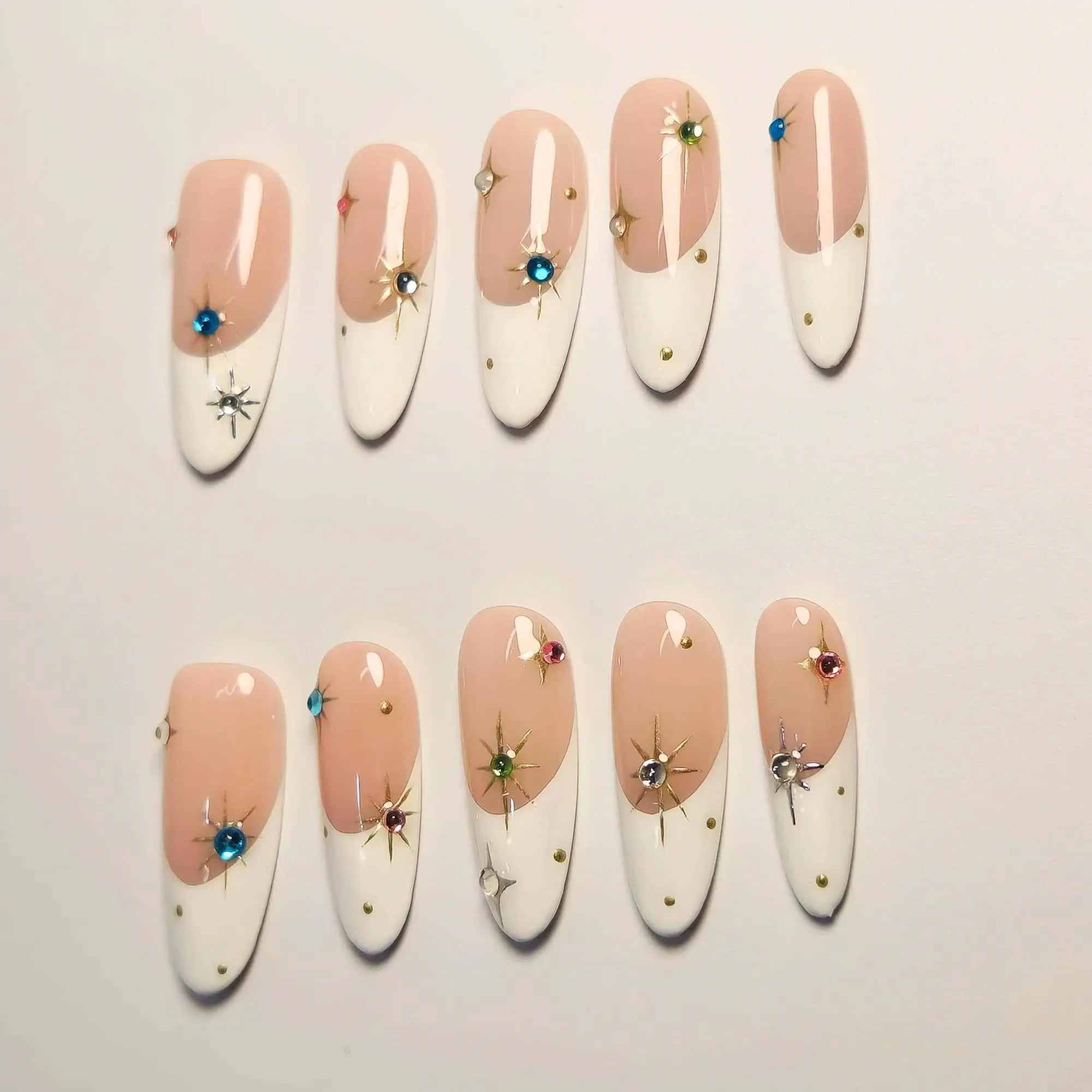 Handmade French tip press-on nails featuring a nude and white color scheme. Each nail is decorated with multicolored starburst gems and metallic accents.