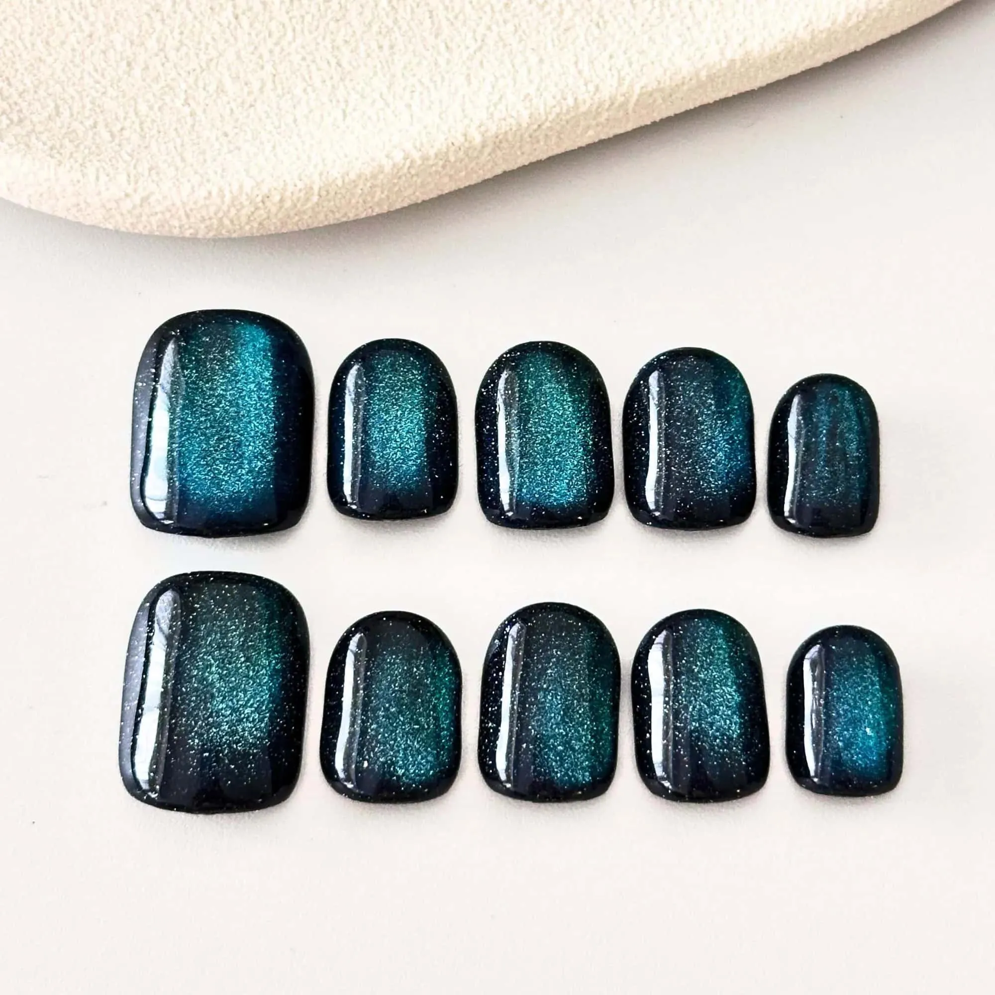 Transform your fingertips into a cosmic galaxy with these blue starry sky press on nails. Featuring a stunning gradient design, these short squoval nails offer a cosmic look that will elevate any outfit. There are also options for other shapes. Perfect as a gift for her or a treat for yourself. Reach for the stars with these fabulous fake nails!