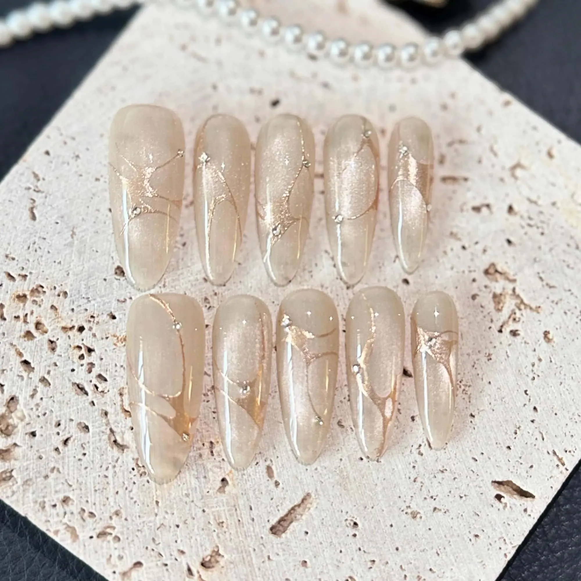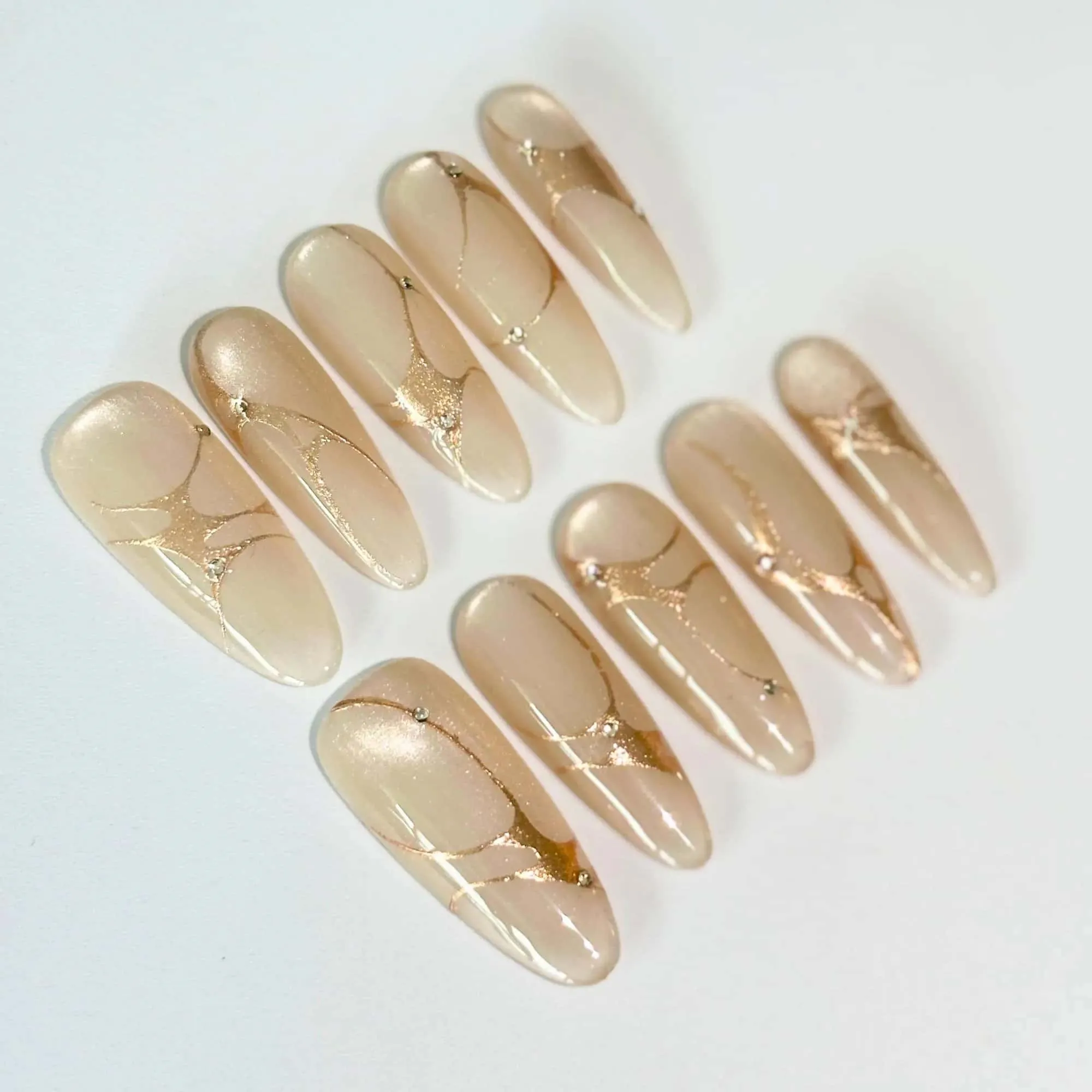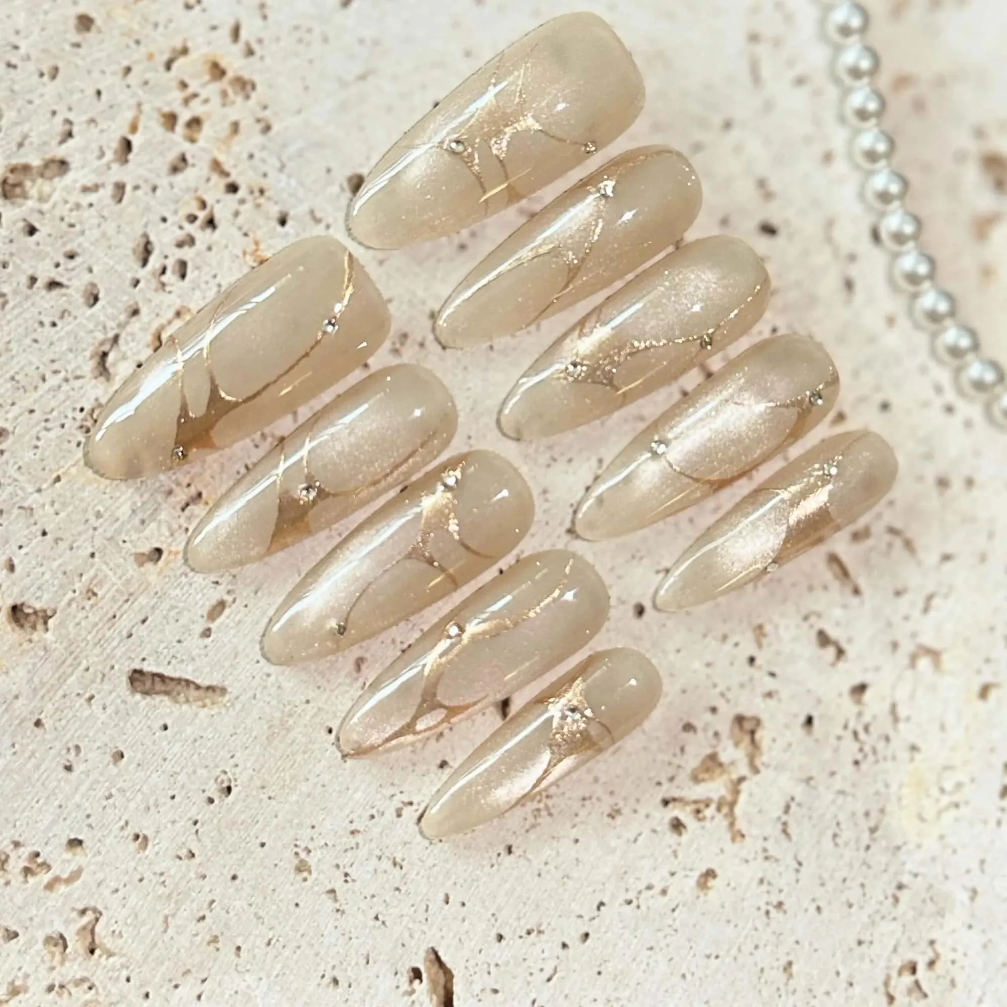Champagne Glitter Rhinestone Press On Nails | Nude Gold False Nails | Long Coffin Luxury Set