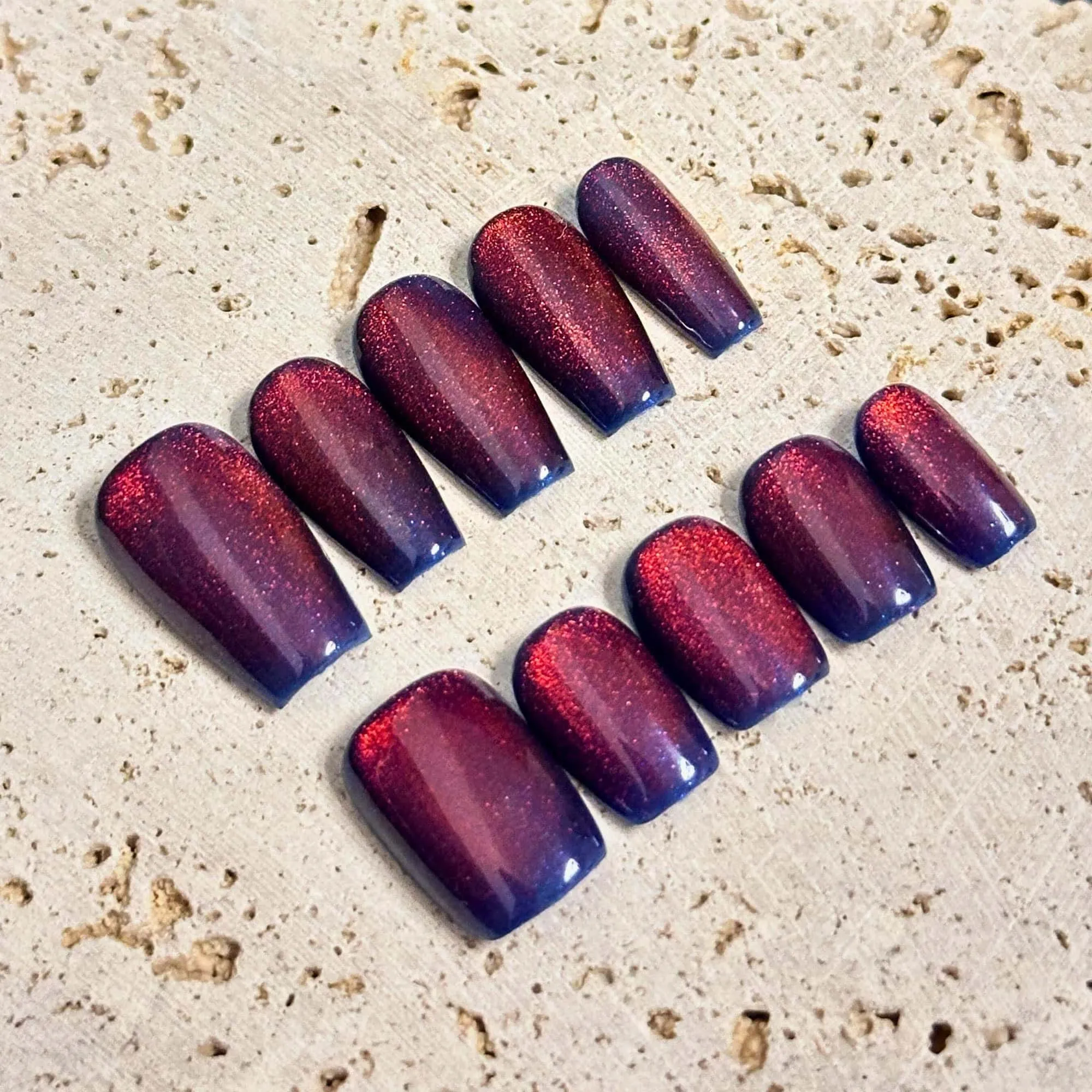 This isn’t some traditional red mani. Our Radiant Red Cat Eye Press On Nails go a shade or two darker than classic red for added richness, while a faint cat-eye shimmer brings just the right amount of flair. Perfect for fall —or any time of year, really—these premium handmade press-ons make it easy to achieve a salon-quality look in minutes.