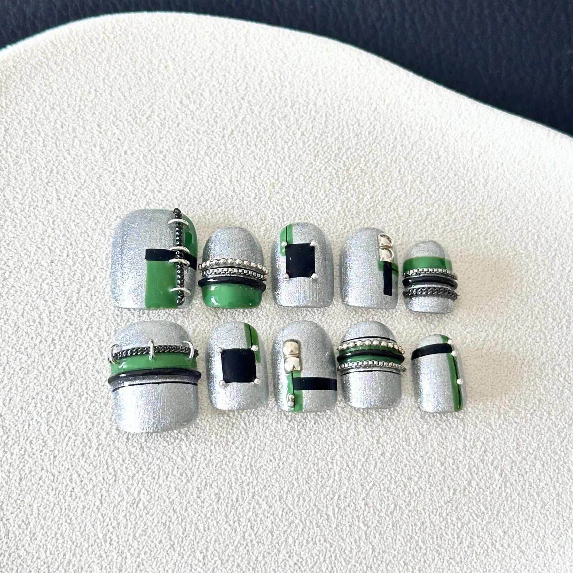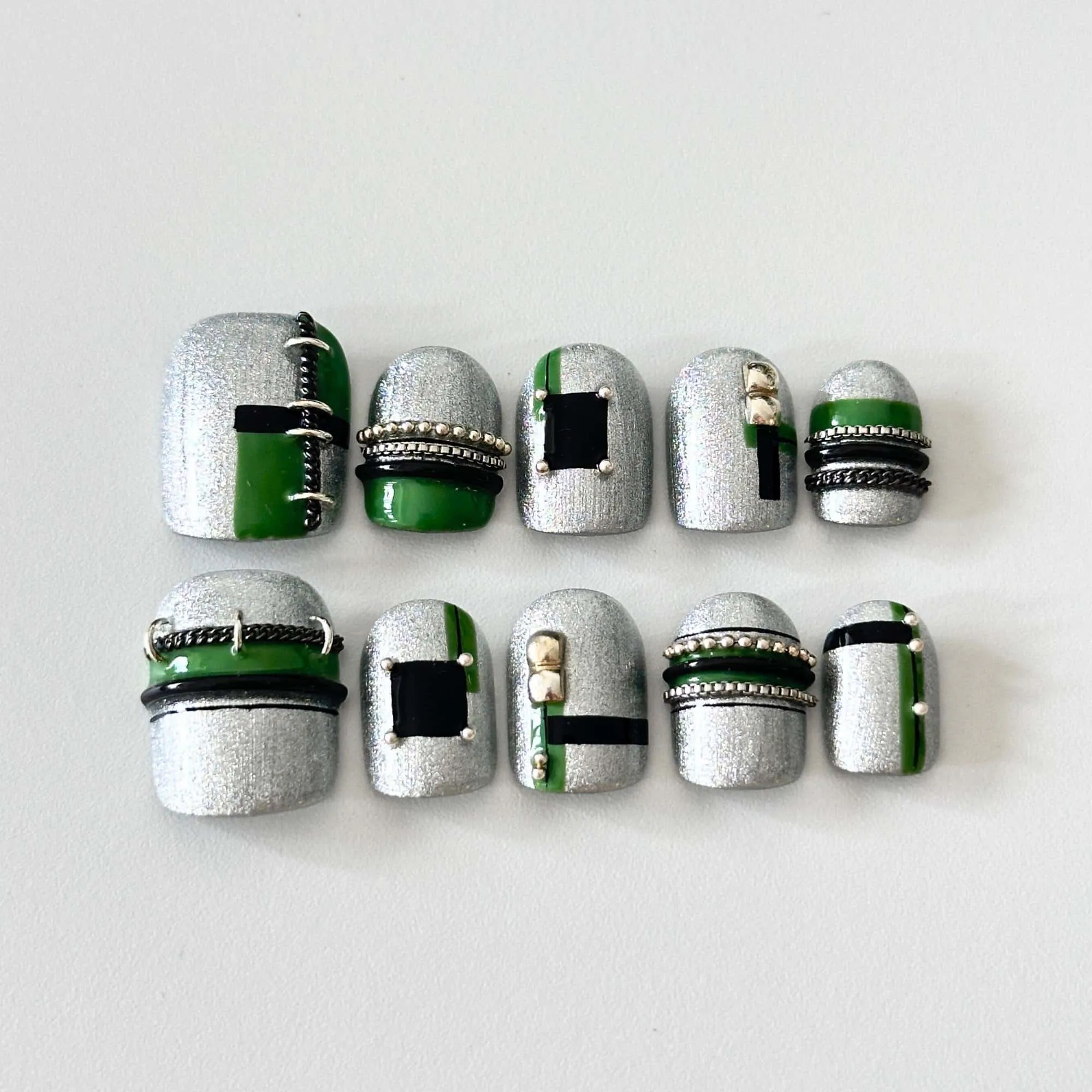 Silver Green Cyberpunk Press On Nails – Handmade False Nails with Edgy Black & Metallic Accents