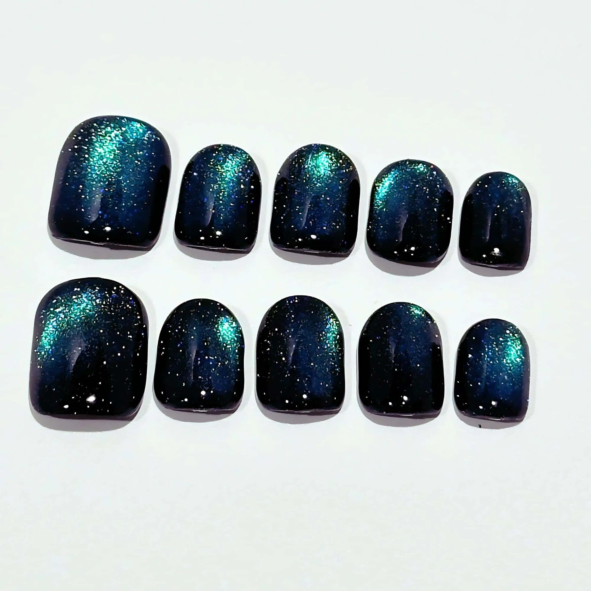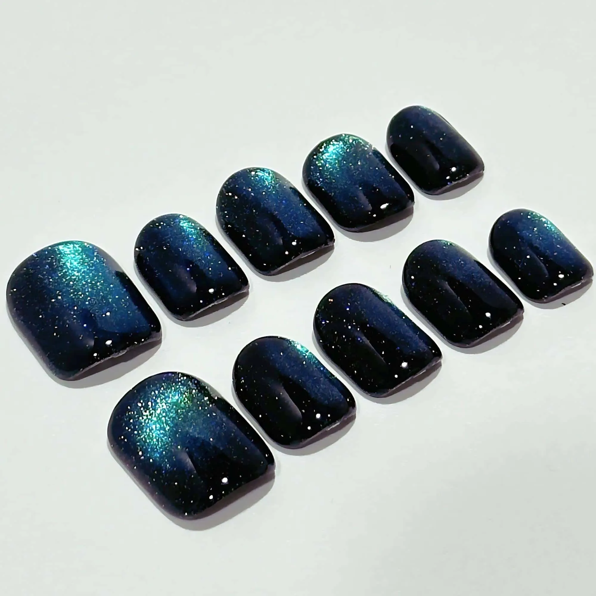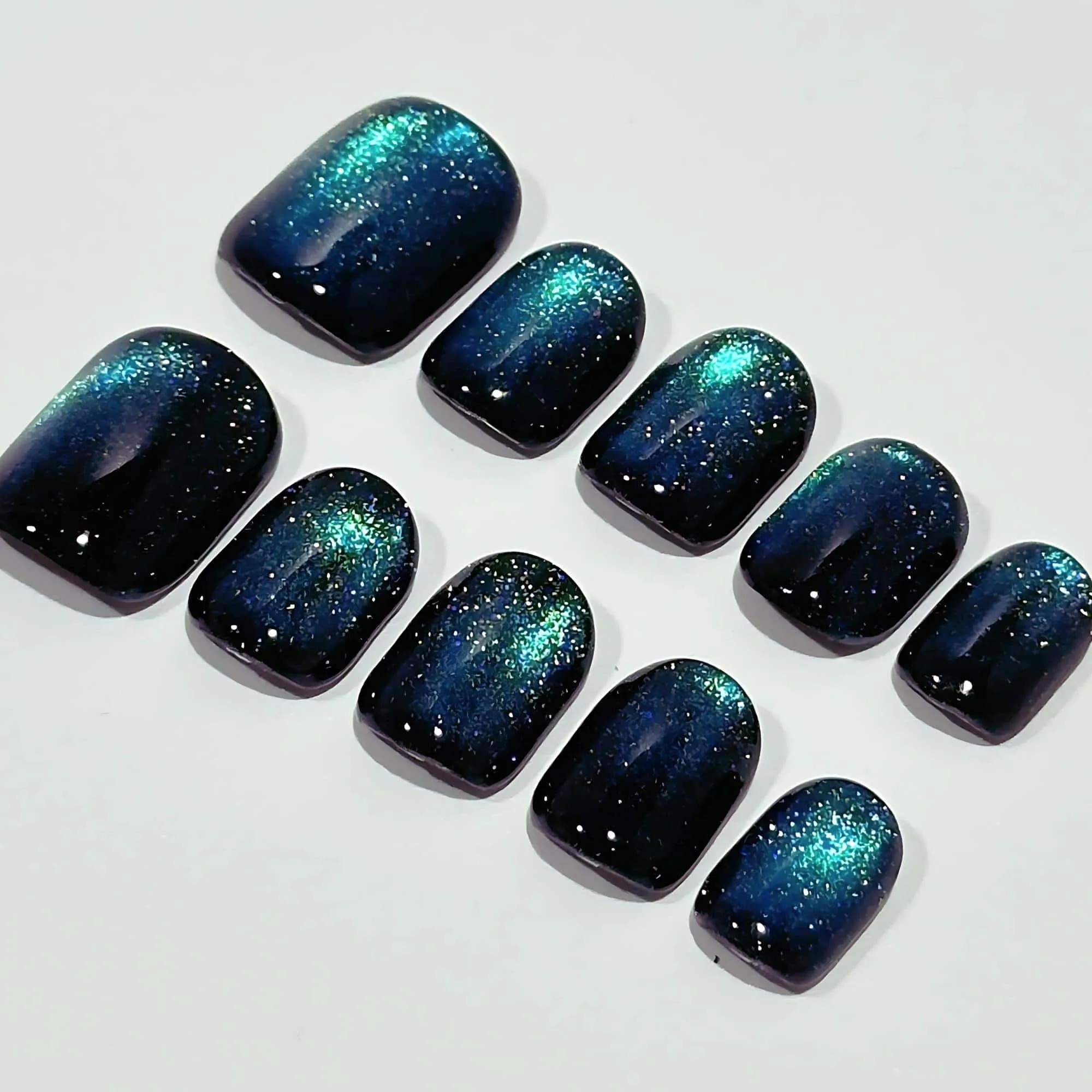 Transform your fingertips into a cosmic galaxy with these blue starry sky press on nails. Featuring a stunning gradient design, these short squoval nails offer a cosmic look that will elevate any outfit. There are also options for other shapes. Perfect as a gift for her or a treat for yourself. Reach for the stars with these fabulous fake nails!