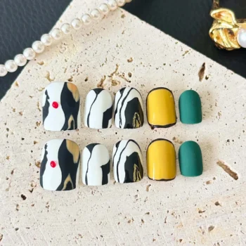 Abstract Press On Nails in Luxe Gold, Emerald Green, and Chic Black & White Marble $35.95
