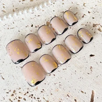 Add a touch of luxury to your nails with these Nude Black French Tip Press On Nails featuring Gold Foil accents. This Elegant Square False Nails set is not only reusable but also exudes elegance and style. Elevate your look effortlessly with this Luxury Nail Set today!