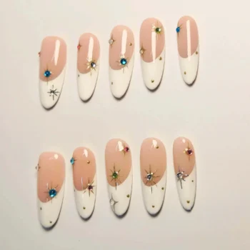 Handmade French tip press-on nails featuring a nude and white color scheme. Each nail is decorated with multicolored starburst gems and metallic accents.