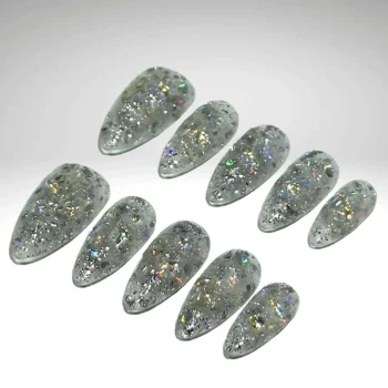 Handcrafted with holographic glitter foil and layered clear gel, each nail catches the light in an otherworldly way. The sleek short stiletto shape adds just the right amount of edge, while the icy glimmer keeps it regal and timeless.Wear them for vibes, cosmic glamour, or when you simply want your nails to shine like stardust.