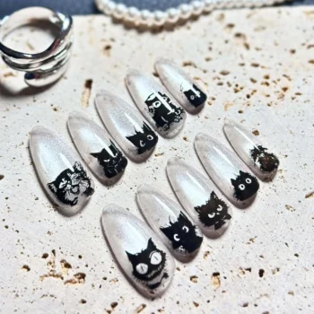 Obsessed with these Crystal Clear Cat Eye Short Press Ons. Handmade to perfection. Perfect for Halloween or any time you want to serve a little mysterious glam. Treat yourself or surprise your bestie as a gift – either way, you gonna love it!