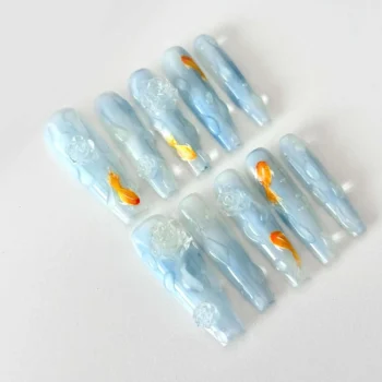 Transform your nails into a work of art with this Elegant Jelly Blue Koi Fish Nail Art Set. Featuring stunning coffin press-ons adorned with crystal flower accents, these nails will make you feel like a true masterpiece.