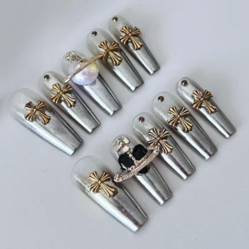 Featuring a unique cross charm, these long coffin-shaped false nails are perfect for any occasion. Each set showcases intricate silver 3D cross designs that add a touch of glam to your look.